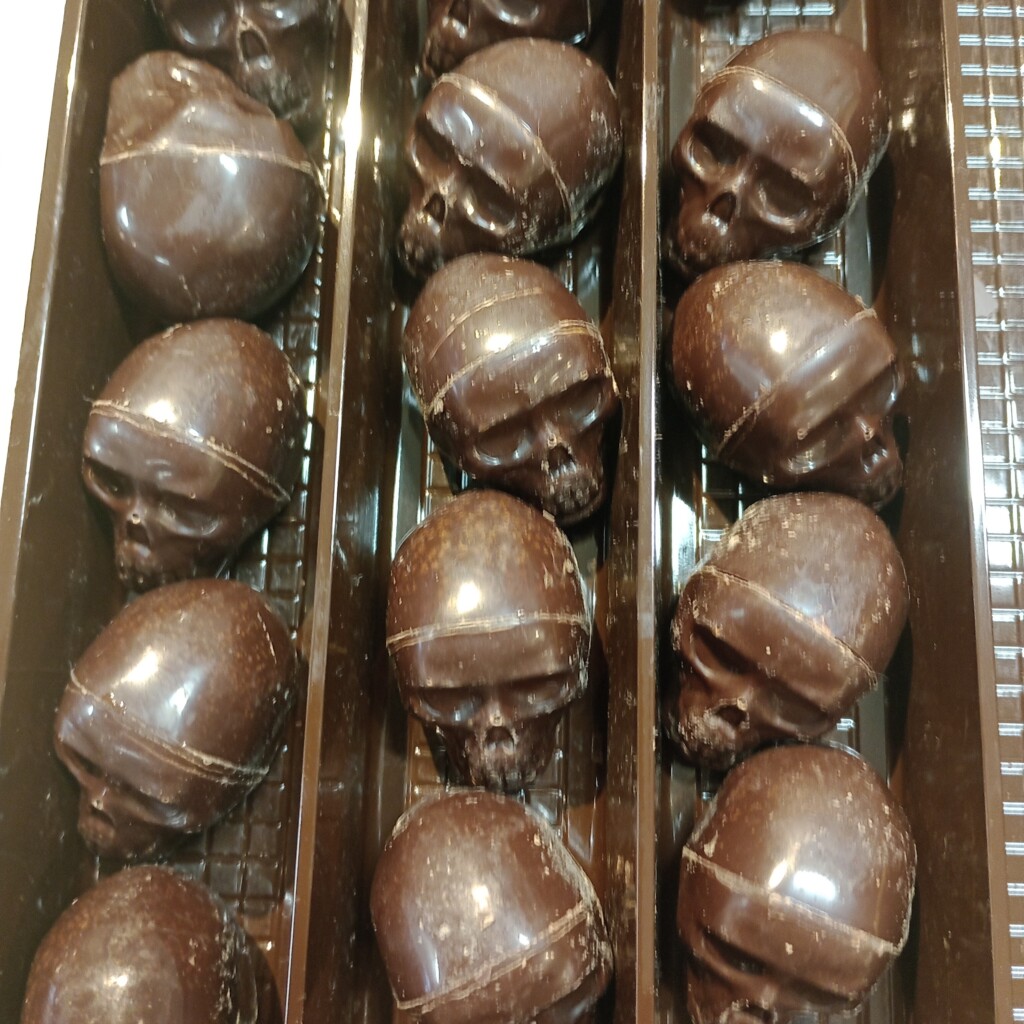 Doodskop in pure chocolade met een vulling van karamel en vanille Madagascar.