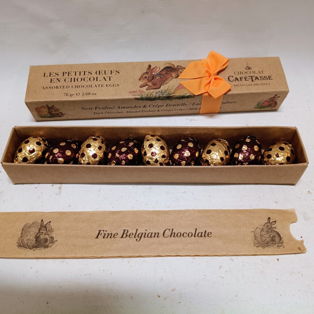 Kartonnen geschenkdoosje van Café-Tasse gevuld met een assortiment van paaseitjes. (76 gram)