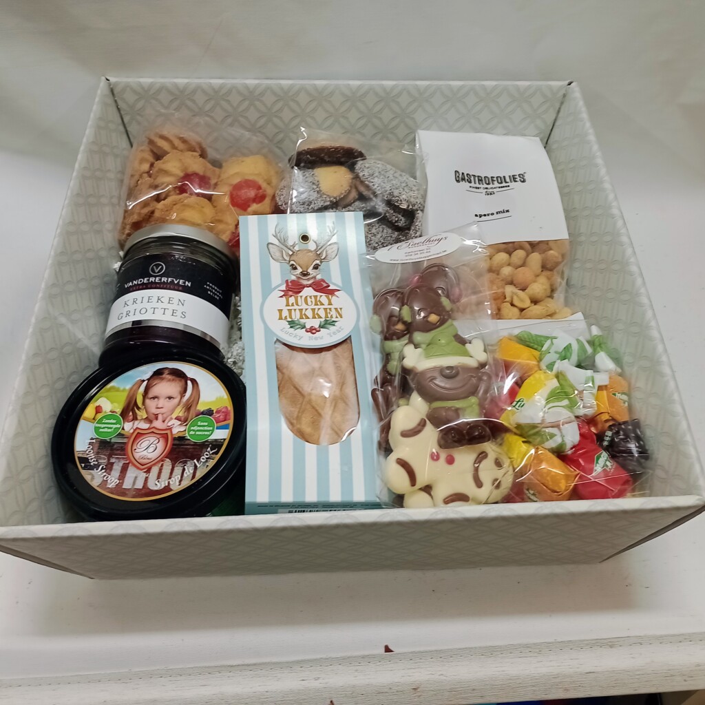 Geschenkmand, afgewerkt met feestelijke strik, gevuld met :