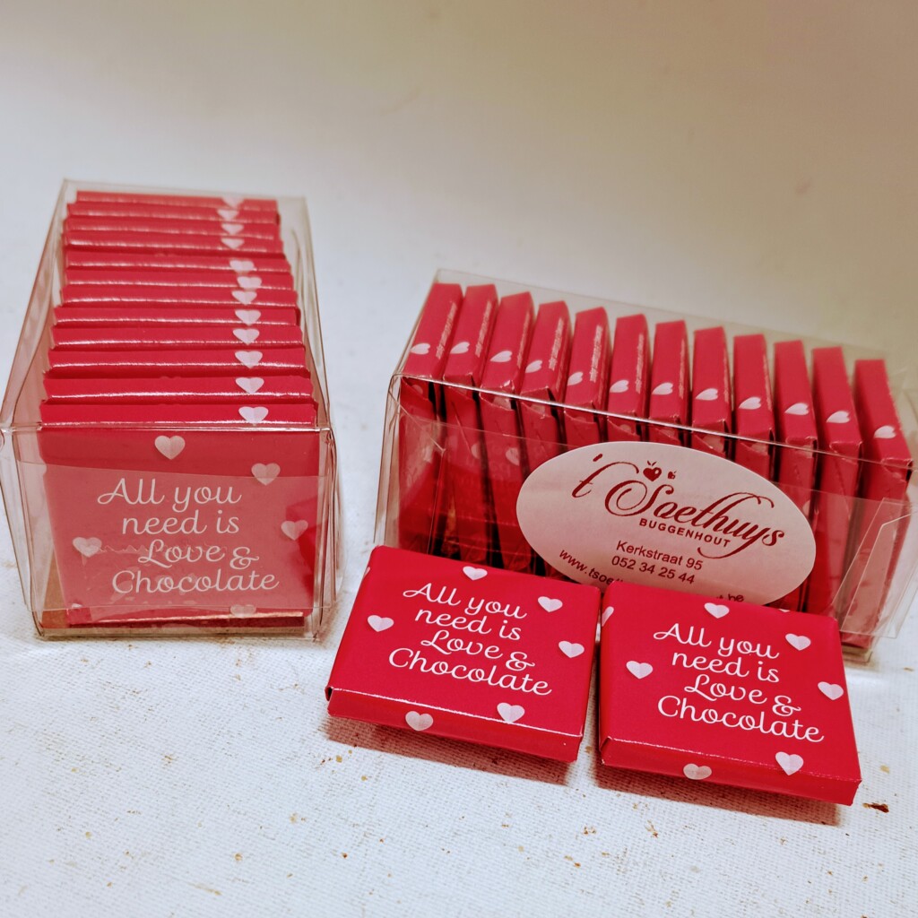 mica-doosje gevuld met 12 napolitains in melkchocolade met de vermelding “all you need is love & chocolate”