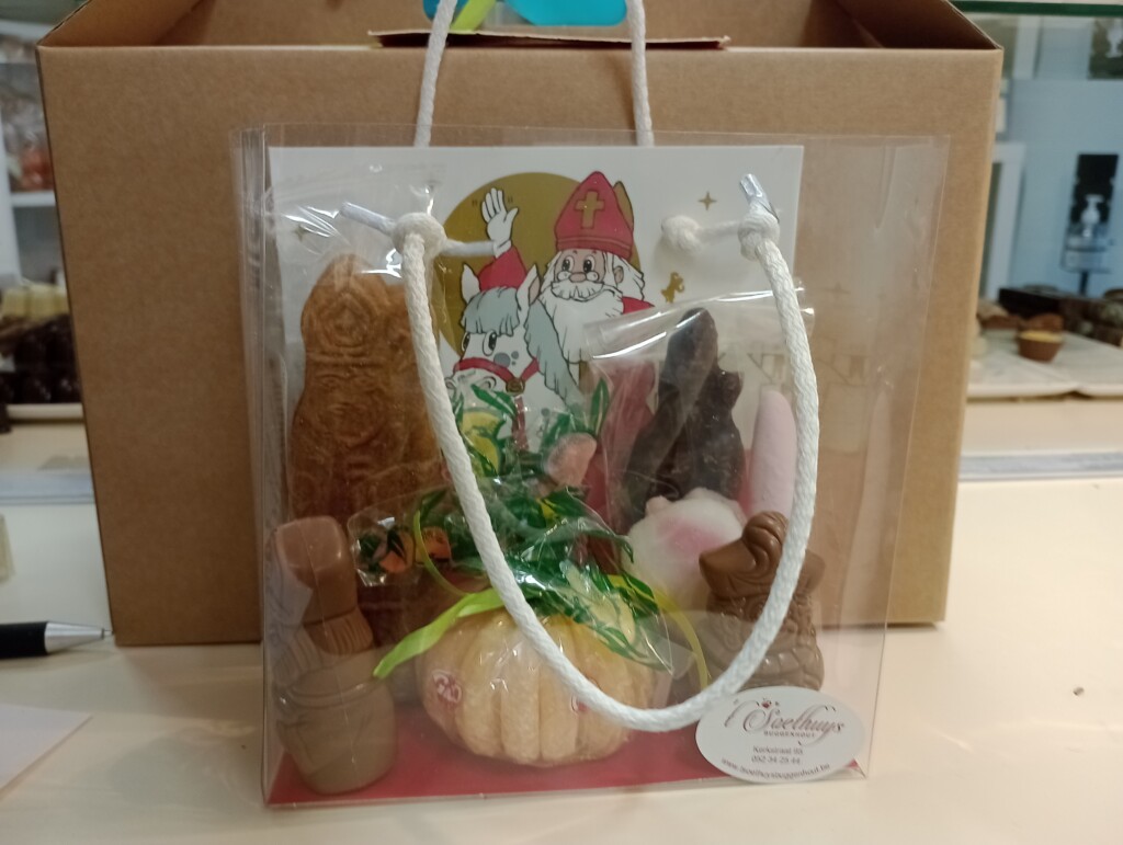 verpakt in open Pet-draagtas en afgewerkt met inlegvel in Sintthema